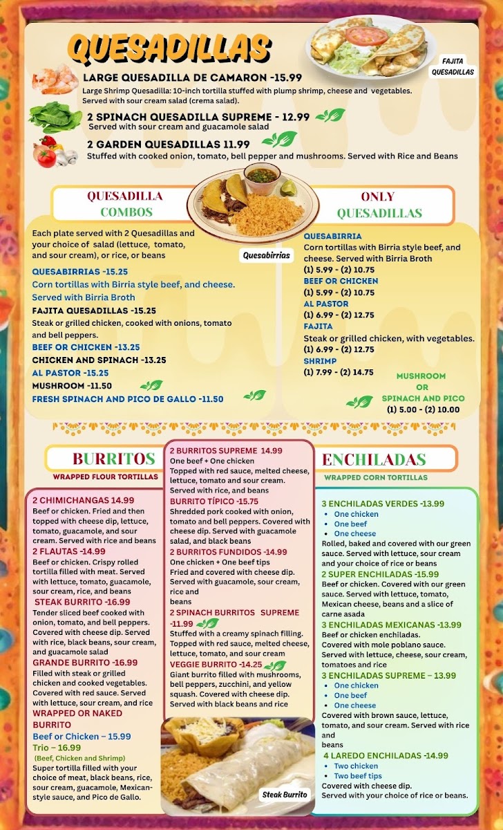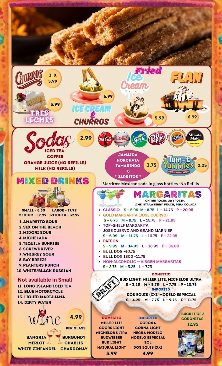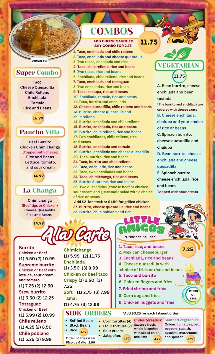 You’ll find hearty combination plates perfect for big appetites, along with tacos, burritos, and quesadillas that keep it simple but satisfying. There’s plenty of variety too - grilled chicken, seasoned steak, fresh shrimp - all wrapped in warm tortillas or served over fluffy rice. And of course, no visit feels complete without chips and salsa to start, maybe even a creamy dip on the side. Whether you’re stopping in for a quick lunch or settling in for a relaxed dinner, the menu offers something that fits the mood and keeps you coming back for another bite.